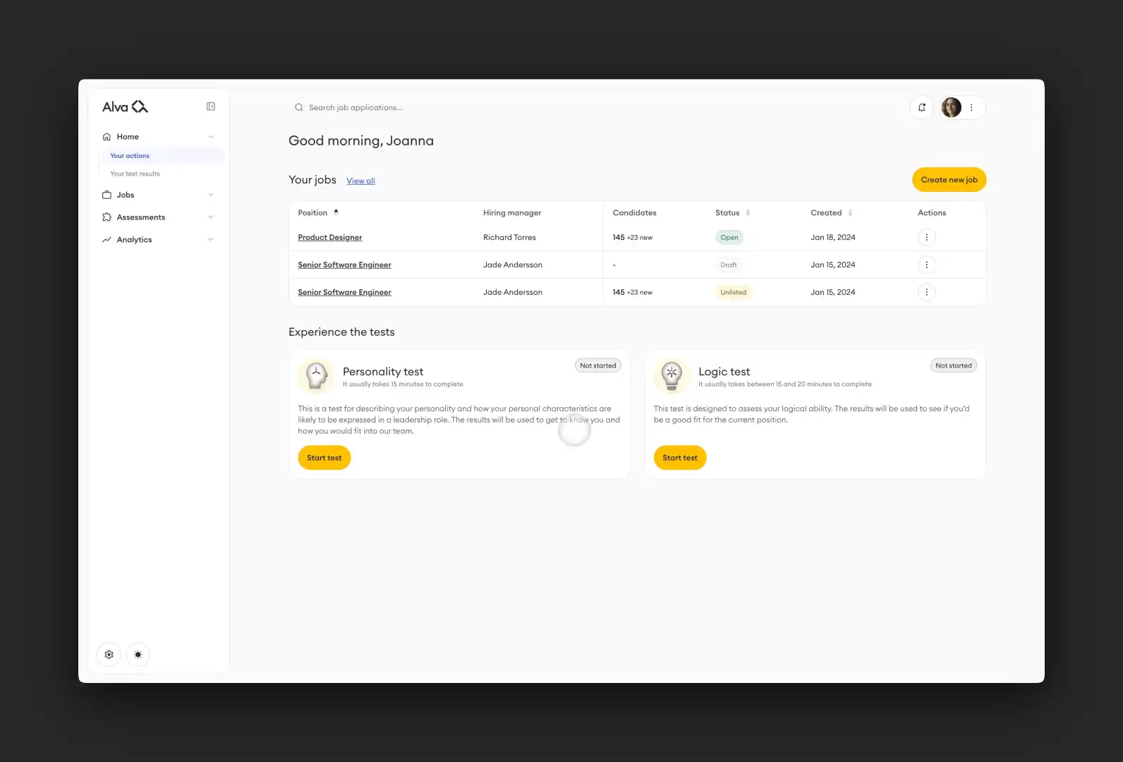 Alva Labs is a Swedish candidate assessment platform that combines science and technology to create fairer hiring processes. Their platform helps companies discover overlooked talent through personality tests, logic assessments, and technical evaluations - all while delivering an excellent candidate experience.
